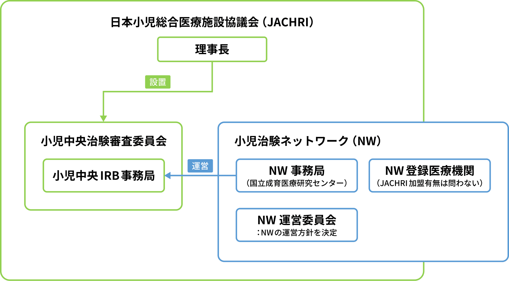 小児治験ネットワークは、日本小児総合医療施設協議会(JACHRI)の下部組織です。同ネットワークの運営・管理は国立成育医療研究センターに委託されています。詳細は「小児治験ネットワーク設置運営規程」をご覧ください。