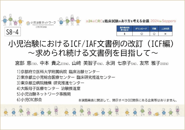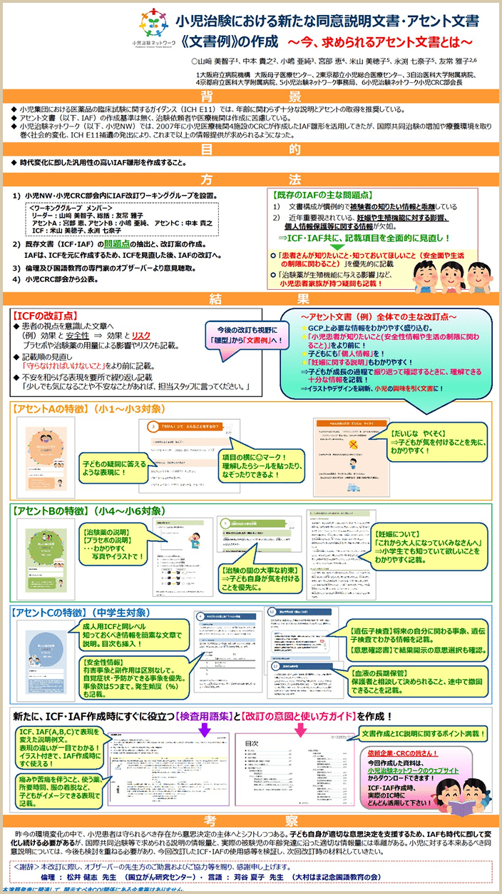 札幌で開催された第24回CRCと臨床試験のあり方を考える会議にて、同意説明文書(文書例)の改訂に関する発表を行いました。大人と子ども、それぞれに汎用できる雛形を考察、改訂に向けて準備したこと等が評価され、「特別賞」を受賞しました。